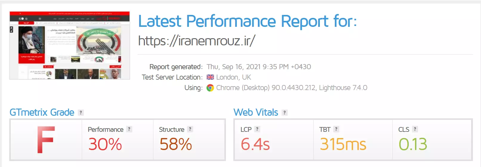 در زیر تصویر و لینک اثبات سئو فنی 100 درصد و کسب رتبه A سایت خبرگزاری ایران امروز را مشاهده می کنید.